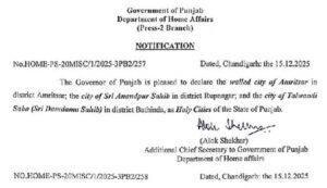 भारत इंफो : पंजाब सरकार ने राज्य के तीन प्रमुख धार्मिक शहरों श्री आनंदपुर साहिब, तलवंडी साबो और श्री अमृतसर साहिब को आधिकारिक तौर पर ‘पवित्र शहर’ (Holy Cities) घोषित कर दिया है। इस संबंध में पंजाब के राज्यपाल गुलाब चंद कटारिया ने औपचारिक अधिसूचना जारी कर दी है। इस घोषणा के साथ ही इन ऐतिहासिक और धार्मिक महत्व वाले शहरों की व्यवस्था में बड़े और कड़े बदलाव लागू किए जाएंगे।