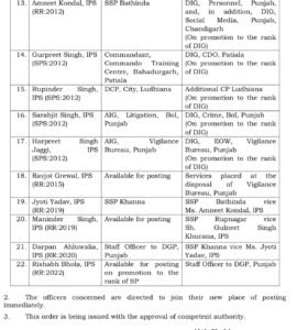 भारत इंफो : पंजाब पुलिस में शनिवार को बड़ा प्रशासनिक फेरबदल किया गया है। राज्य सरकार ने 22 आईपीएस अधिकारियों के तबादले के आदेश जारी किए हैं। इस तबादला सूची में बठिंडा सहित तीन जिलों के वरिष्ठ पुलिस अधीक्षकों (SSP) के नाम भी शामिल हैं। सरकार के इस फैसले को पुलिस प्रशासन में नई ऊर्जा और बेहतर कार्यप्रणाली लाने की दिशा में अहम कदम माना जा रहा है।
