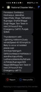 SDMA के मुताबिक यह मौसम गतिविधियां अमृतसर, फतेहगढ़ साहिब, फिरोजपुर, गुरदासपुर, होशियारपुर, जालंधर, कपूरथला, लुधियाना, मोगा, मलेरकोटला, पठानकोट, पटियाला, रूपनगर, शहीद भगत सिंह नगर, एसएएस नगर और तरनतारन जिलों में अलग-अलग स्थानों पर देखने को मिल सकती हैं। प्रशासन ने संबंधित जिलों को सतर्क रहने के निर्देश दिए हैं।