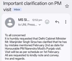 मामले के तूल पकड़ने के बाद मनजिंदर सिरसा के कार्यालय की ओर से आधिकारिक सूचना जारी की गई। इसमें बताया गया कि सिरसा से तारीख बताने में गलती हो गई थी और प्रधानमंत्री नरेंद्र मोदी का जालंधर दौरा 1 फरवरी को ही फाइनल है।