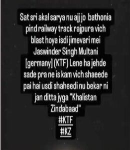इस बीच खालिस्तान टाइगर फोर्स ने सोशल मीडिया पोस्ट के जरिए इस धमाके की जिम्मेदारी लेने का दावा किया है। पोस्ट में कहा गया कि जर्मनी में बैठे जसविंदर सिंह मुल्तानी ने इस हमले की जिम्मेदारी ली है। हालांकि, इस दावे की आधिकारिक पुष्टि नहीं हुई है।